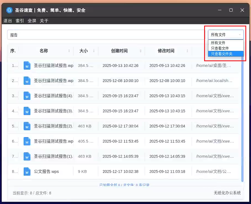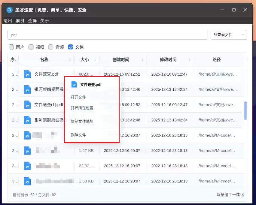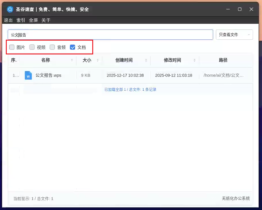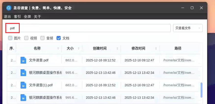 1. 快速查询+安全兜底:适配国产操作系统,如麒麟、中科方德、统信等,适配国产芯片如海光、飞腾、龙芯等,同时支持专用机与通用机使用,安全合规更可靠;建好索引后输入关键词能快速出结果,深层文件夹里的老旧文件也能快速精准命中。